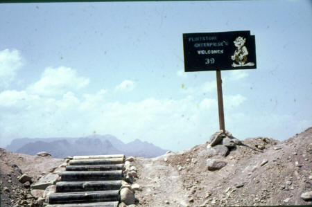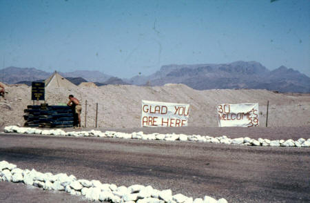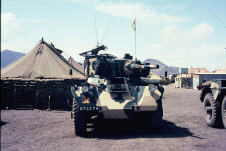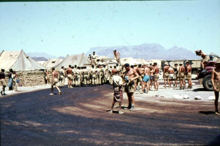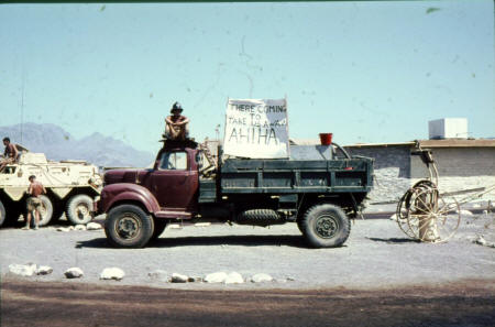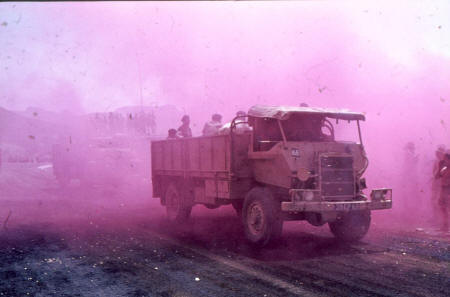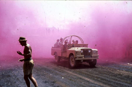 Welcoming red smoke bombs. First land rover through the smoke, apparently 39 SQN Officer in charge of Advance party |