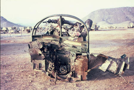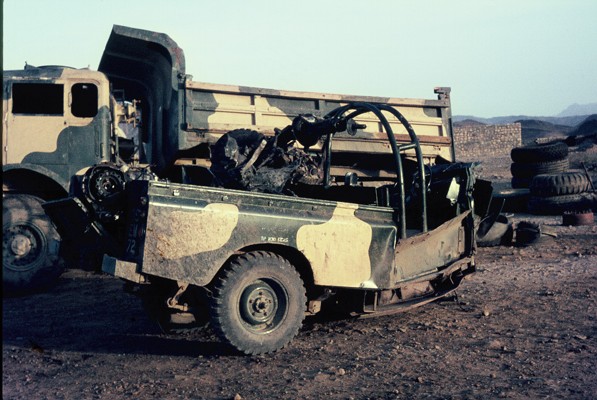 | what's left of a Land Rover after going over a land mine | Another view of the Land Rover | |